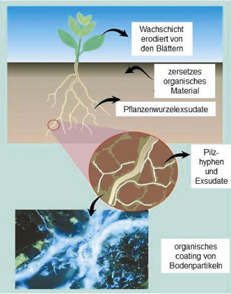 Der Wasserabstoßungseffekt, im Folgenden kurz Hydrophobie genannt, tritt bei den verschiedensten Bodentypen auf und stellt vor allem in Böden von Rasenflächen mit hohem Pflegeaufwand auch ein kommerziell sehr wichtiges Problem dar. Hydrophobie in Böden resultiert aus einer Vielzahl an hydrophoben (Wasser abstoßenden) organischen Substanzen, die sich als unpolares „Coating“ (Überzug) an Bodenpartikeln anlagern. Diese organischen Materialien, die von Pilzhyphen, Bodenbakterien, Huminstoffen, Pflanzenwurzelexsudate oder pflanzlichen Abbauprodukten (Blattwachse, Schnittgut, tote Wurzeln, Filz) stammen (siehe Abbildung 2), sammeln sich in den Bodenporen oder auf der Oberfläche von Bodenpartikeln an. Nach wiederholtem Befeuchten und Trocknen unterliegt die organische Masse des Bodens einer konformativen Veränderung, die in einem unpolaren, hydrophoben Überzug resultiert. Sogar geringe Mengen an hydrophober organischer Masse beeinflussen den Wassertransport und die Befeuchtung des Bodens.