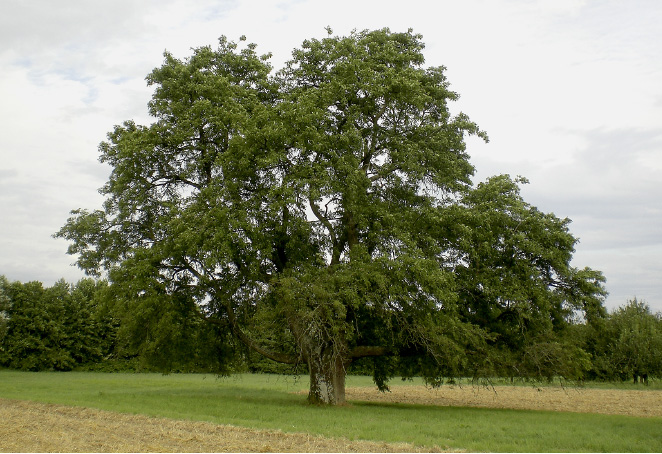 Gewissermaßen als großen Bruder der Eberesche kann man den Speierling (Sorbus domestica L.) ansehen. An Statur ist er wesentlich größer; er hat im Alter eine weit ausladende Krone, die bis 20 Meter breit werden und im Freistand bis 20 Meter Höhe erreichen kann. Zudem soll er ein wesentlich höheres Alter – angegeben werden 500 bis 600 Jahre – erreichen. In Abbildung 12 ist ein großes stattliches Exemplar zu sehen.
