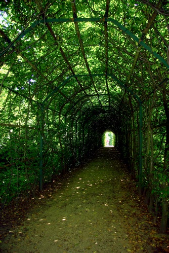 Aber auch Laubengänge spielen in diesen Anlagen eine besondere Rolle, beispielsweise am Rand von Blumenparterres. In diesen Laubengängen kann bei hochsommerlichen Temperaturen eine erfrischende Kühle genossen werden. Öffnungen im Geflecht der Hainbuchenzweige, ähnlich Fenstern, geben den Blick frei auf das Blumenparterre. Die Hainbuche mit ihren dünnen, biegsamen Zweigen ist für ein solches Geflecht, das an einem eigens konstruierten und aufgestellten Gerüst, gezogen wird, besonders geeignet (Abbildungen 18 und 19).