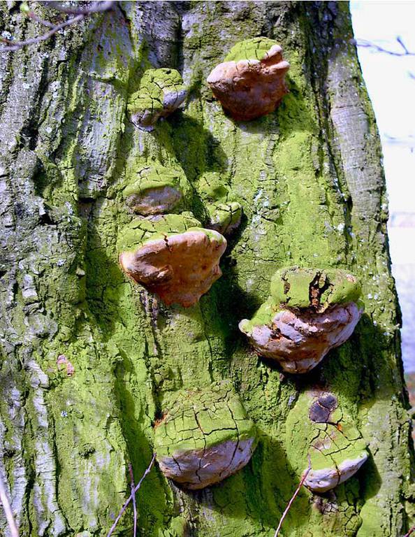Alte Fruchtkörper sind meistens eher kugelförmig, zu sehen in der Mitte von Abbildung 5. Ihre Oberfläche ist rissig und zeigt schwach ausgeprägte Zuwachsstreifen (Abbildung 6); meist ist die Hutoberseite durch Algenbewuchs intensiv grün gefärbt (Abbildung 7). Sind mehrere Fruchtkörper vorhanden, dann stehen diese oftmals in engerer Nachbarschaft. Im Laufe der Jahre bildet sich an einer solchen Stelle eine tiefere Rinne (Abbildungen 5 und 7), weil in diesem Bereich das Kambium angegriffen, beziehungsweise zerstört ist. Die Eiche kompensiert die Bruchgefahr durch Zuwachs im Umfeld – an den Rändern – des Schadens.