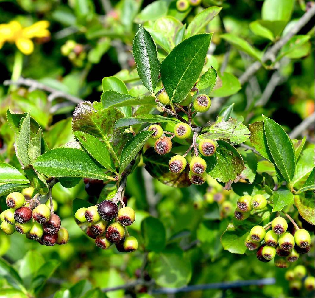 Die Schwarze Apfelbeere kommt im östlichen Kanada und Nordamerika vor. Sie wächst als ein bis drei Meter hoher Strauch. Die Blütezeit reicht von Mai bis August je nach Standort. Die ungeteilten Laubblätter haben einen fein gesägten Blatt-rand. Die weißen Blüten mit jeweils fünf Kelch- und Blütenblättern stehen in schirmartigen Blütenständen, die Staubblätter haben rot gefärbte Staubbeutel (Abbildung 21). Die Früchte, rundliche Apfelfrüchte, sind zunächst grün gefärbt und erinnern an die Früchte von Ebereschen (Abbildung 22). Deshalb werden die Aroniabeeren mitunter auch als Schwarze Eberesche bezeichnet, allerdings gehört die Eberesche in die Gattung Sorbus. In Mitteleuropa wird die Schwarze Apfelbeere mittlerweile in vielen Gärten angebaut. Sie wird geschätzt wegen ihrer schwarzen Früchte (Abbildung 23), das Fruchtfleisch ist tiefrot gefärbt. Die herbsüßlich schmeckenden Früchte reifen von Oktober bis Dezember und werden für die Herstellung von Marmelade, Gelee, Saft und auch Wein verwendet. Inzwischen gibt es vier Sorten, die sich in Form und Größe der Früchte unterscheiden.