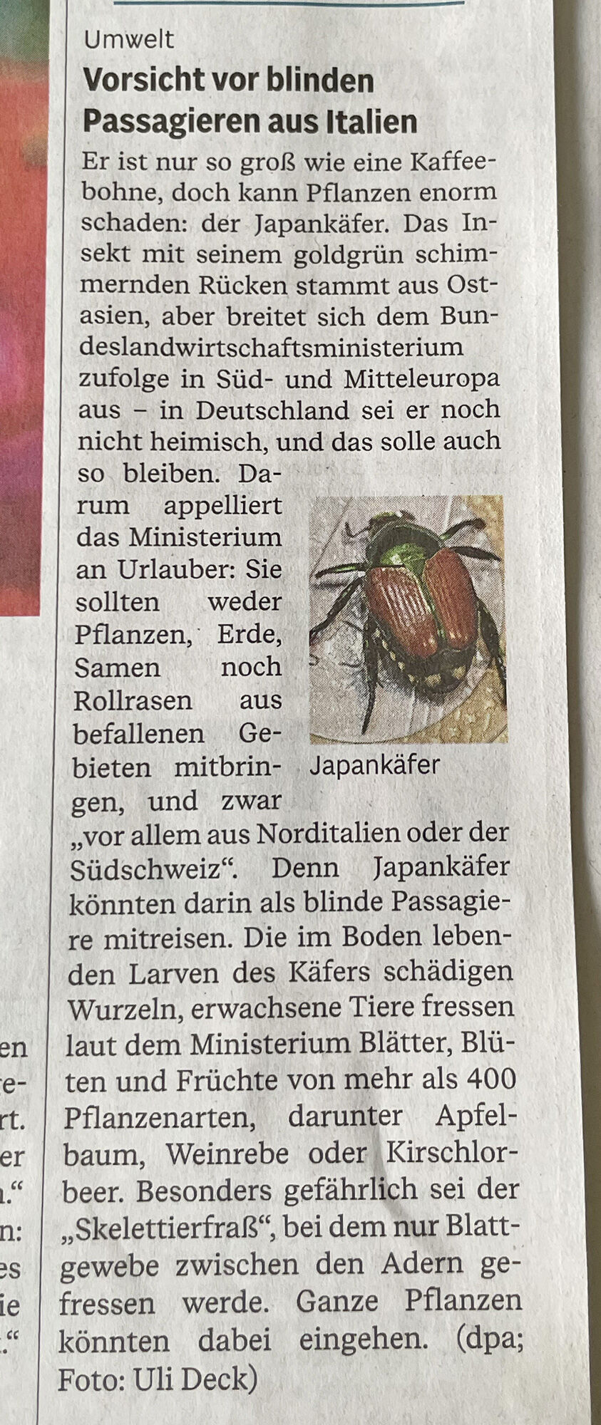 Die Verschleppung von erwachsenen Käfern kann mit Pflanzen oder Schnittgut erfolgen, Larven oder Puppen werden mit Boden transportiert. Zudem besteht die Gefahr, dass Käfer über den Reise- oder Güterverkehr als ,blinder Passagier‘ in Fahrzeugen, Bahn, LKWs, PKW oder auch dem Gepäck eingeschleppt werden (s. Foto Beitrag ,Vorsicht vor blinden Passagieren aus Italien‘ in der Augsburger Allgemeinen Zeitung v. 23.07.25). Durch aktiven Flug können die Käfer bis zu 24 km im Jahr zurücklegen.