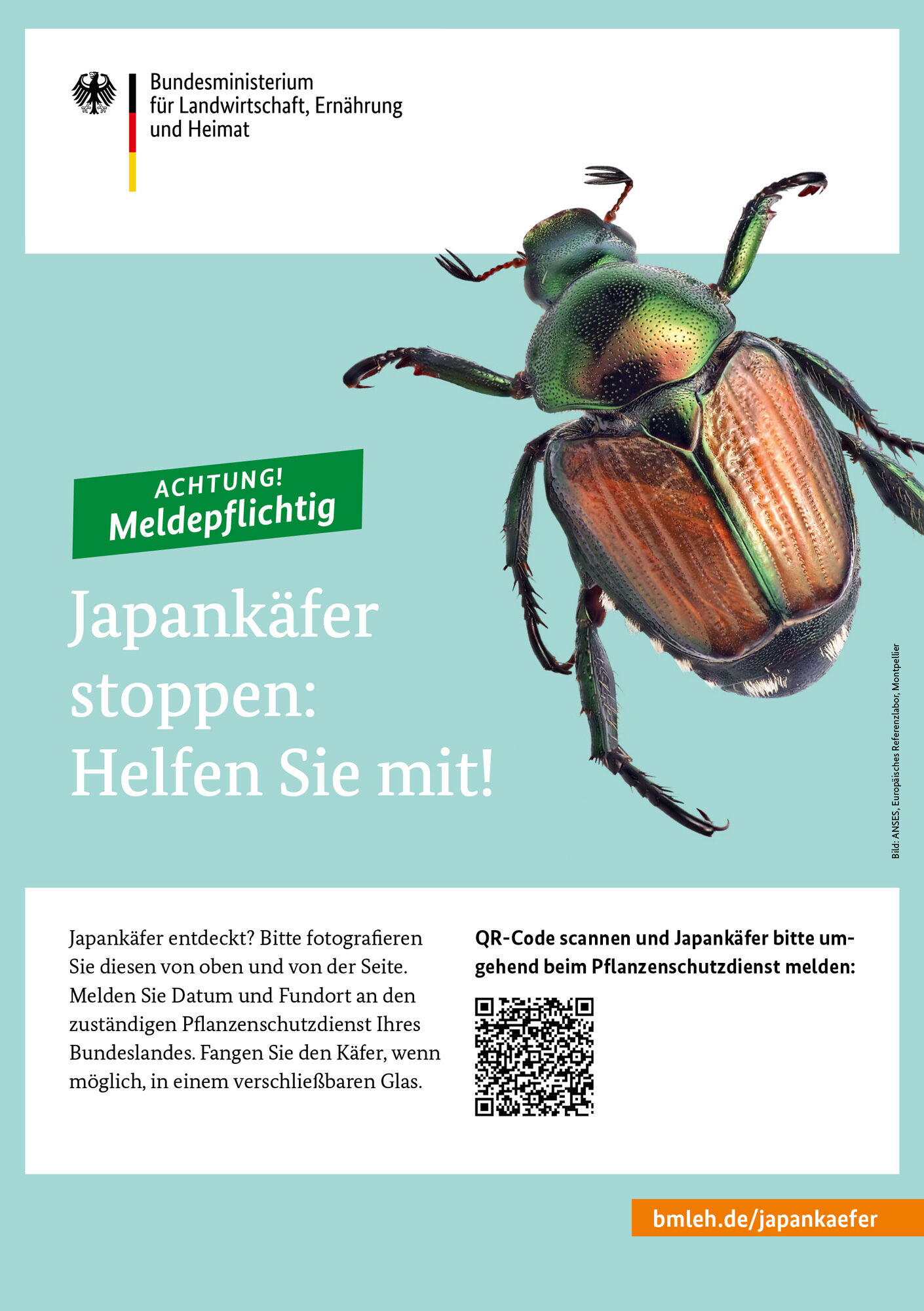 Die Chance, eine Ausbreitung zu verhindern, ist umso größer, je früher der Japankäfer entdeckt wird. Landesweit besteht die Aufforderung, sich mit dem zuständigen Pflanzenschutzdienst in Verbindung zu setzen. Bei Verdacht sollten Käfer eingefangen, eingefroren und fotografiert werden. Informationen und Ansprechpartner sind auf der Seite des Bundesministeriums für Landwirtschaft, Ernährung und Heimat zu finden (direkter Link: https://bit.ly/4ozPrTN).
