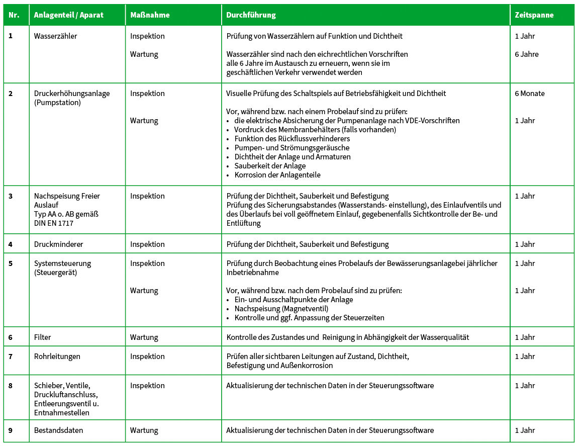 Bewässerungsanlagen müssen regelmäßig vom Betreiber bzw. von einem Fachkundigen inspiziert werden. Insbesondere sollten die Wasserzähler, die Trinkwasserschutzeinrichtungen, die Niveau- und Pumpensteuerung, die Schieber, Ventile und Regner in regelmäßigen Zeitintervallen geprüft werden (siehe Tabelle 1). Längere oder kürzere Zeitintervalle für die Instandhaltung als in Tabelle 1 angegeben, können sich durch spezielle anlagen- und betriebstechnische Randbedingungen ergeben; zusätzlich sind die Angaben der Hersteller für Betrieb und Wartung zu beachten. Inspektionen dürfen vom Betreiber der Anlage selbst vorgenommen werden. Wartungen und Instandsetzungen sind von Fachkundigen durchzuführen.