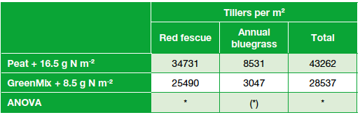 Two weeks after seeding the turf coverage was significantly better on GM rootzones than on PEAT rootzones (Figure 1). Two months after seeding this effect was reversed as PEAT rootzones had slightly, although not significantly, better coverage than GM rootzones. By the end of the growing season, the number of red fescue tillers was significantly higher on PEAT rootzones that had received 16.5 g N m-2 than on GM rootzones that had received 8.5 g N m-2 (Table 2). Annual bluegrass constituted 10-20 % of the total tiller population on all plots and showed a tendency (P = 0.09) to more tillers on PEAT rootzones than on GM rootzones. The total tiller density by the end of the grow-in year was 34 % lower on GM rootzones than on peat-amended rootzones (Table 2).